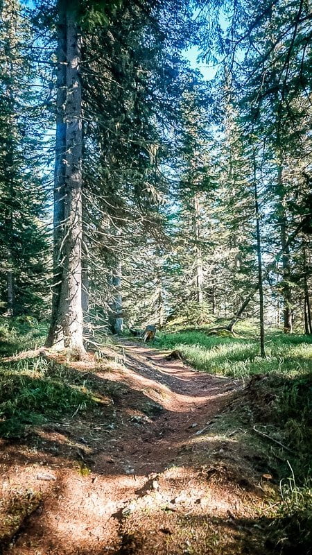 Nach einer kurzen Snackpause geht es dann nur noch in eine Richtung: Bergauf! Und zwar über eine zermürbende, endlos anmutende Forststraße ohne Aussicht. Ein Hörbuch lullt mich angenehm ein in eine fast schon meditativ wirkende Monotonie. Die Hitze an diesem Spätsommertag schlaucht mich. Aber gerade, als ich zunehmend genervter werde und schon einer Kuhherde meine Verzweiflung anvertraue, wird alles anders.